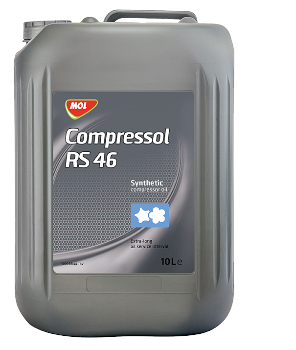MOL Compressol RS 46 é um óleo de compressor sintético de alto desempenho desenvolvido para a lubrificação de compressores de parafuso e compressores de alhetas. É um óleo sintético à base de polialfaolefina (PAO) que contém uma combinação equilibrada de aditivos que inibem a oxidação, a corrosão, o desgaste e a formação de espuma. Garante excelente proteção e desempenho para compressores rotativos que trabalham com lubrificação por injeção de óleo e produzem altas pressões e altas temperaturas no final da compressão. Por um curto período de tempo, ele suporta temperaturas finais de compressão superiores a 100 °C. Ele permite que vidas mais longas de serviço de óleo sejam alcançadas em relação aos óleos de compressor à base de óleo mineral, se condições apropriadas estiverem disponíveis (carga, temperatura ambiente, qualidade do gás transferido).